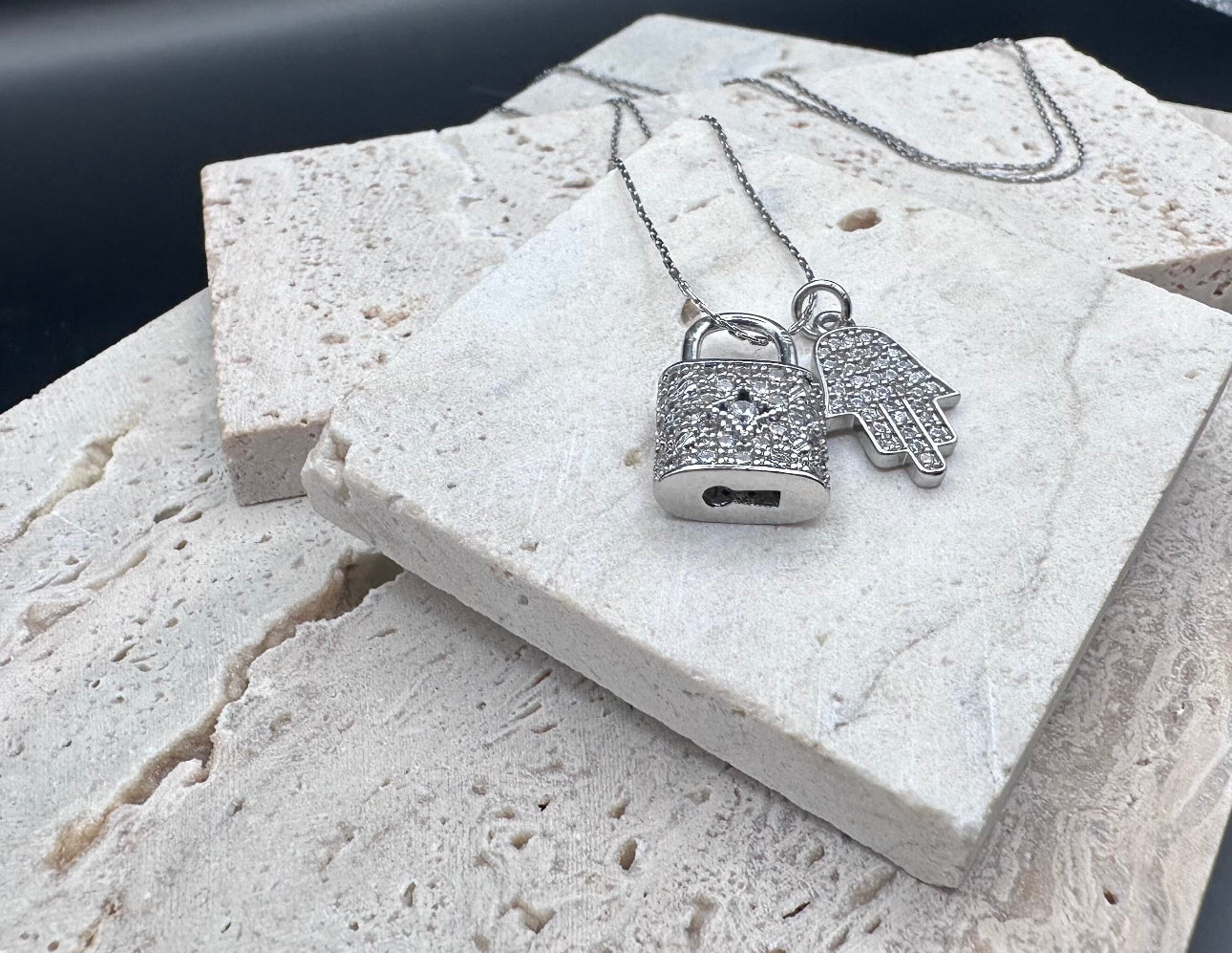 Silver Diamond Lock and Hamsa Charm Necklace , 20’ Chain