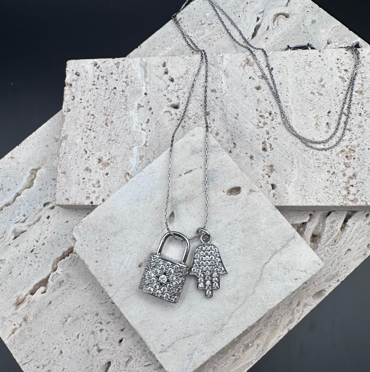 Custom Made - Silver Diamond Lock and Hamsa Charm Necklace , 20’ Chain