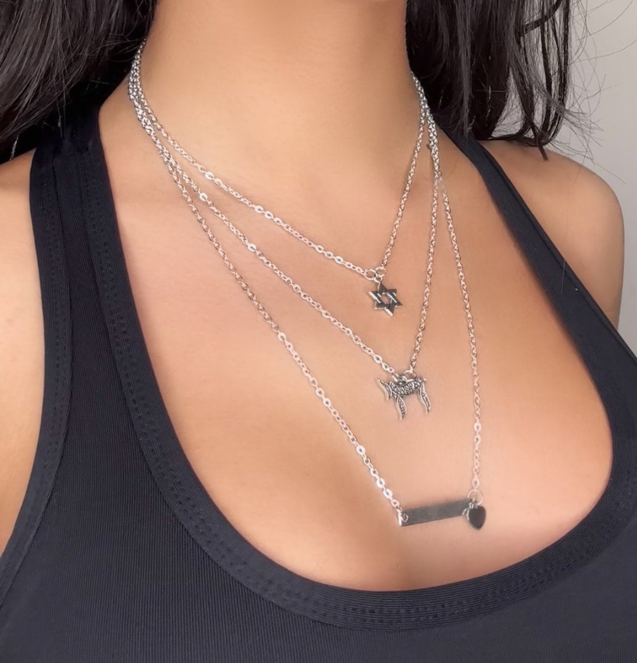 Triple Layer Silver Magen David Star of David , Hai / Chai , and Heart Pendants Necklace